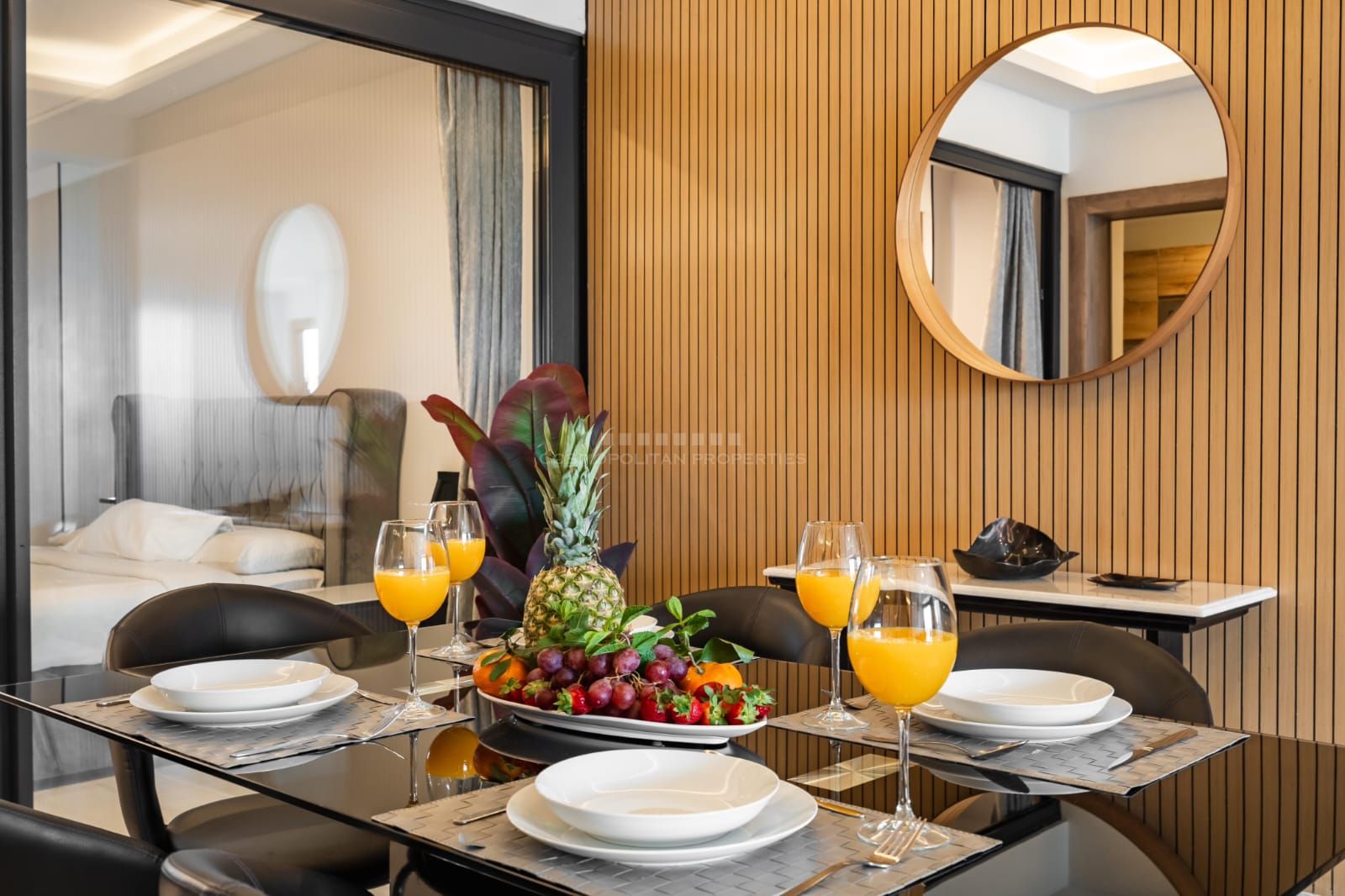 Rodeado de exuberantes jardines tropicales, este complejo cuenta con una piscina comunitaria, fuentes y cascadas que crean un ambiente de paz y tranquilidad. Además, el acceso directo a la playa te permitirá disfrutar del sol y el mar en cualquier momento. El luminoso comedor, adyacente a una cocina americana totalmente equipada, es perfecto para recibir a amigos y familiares.