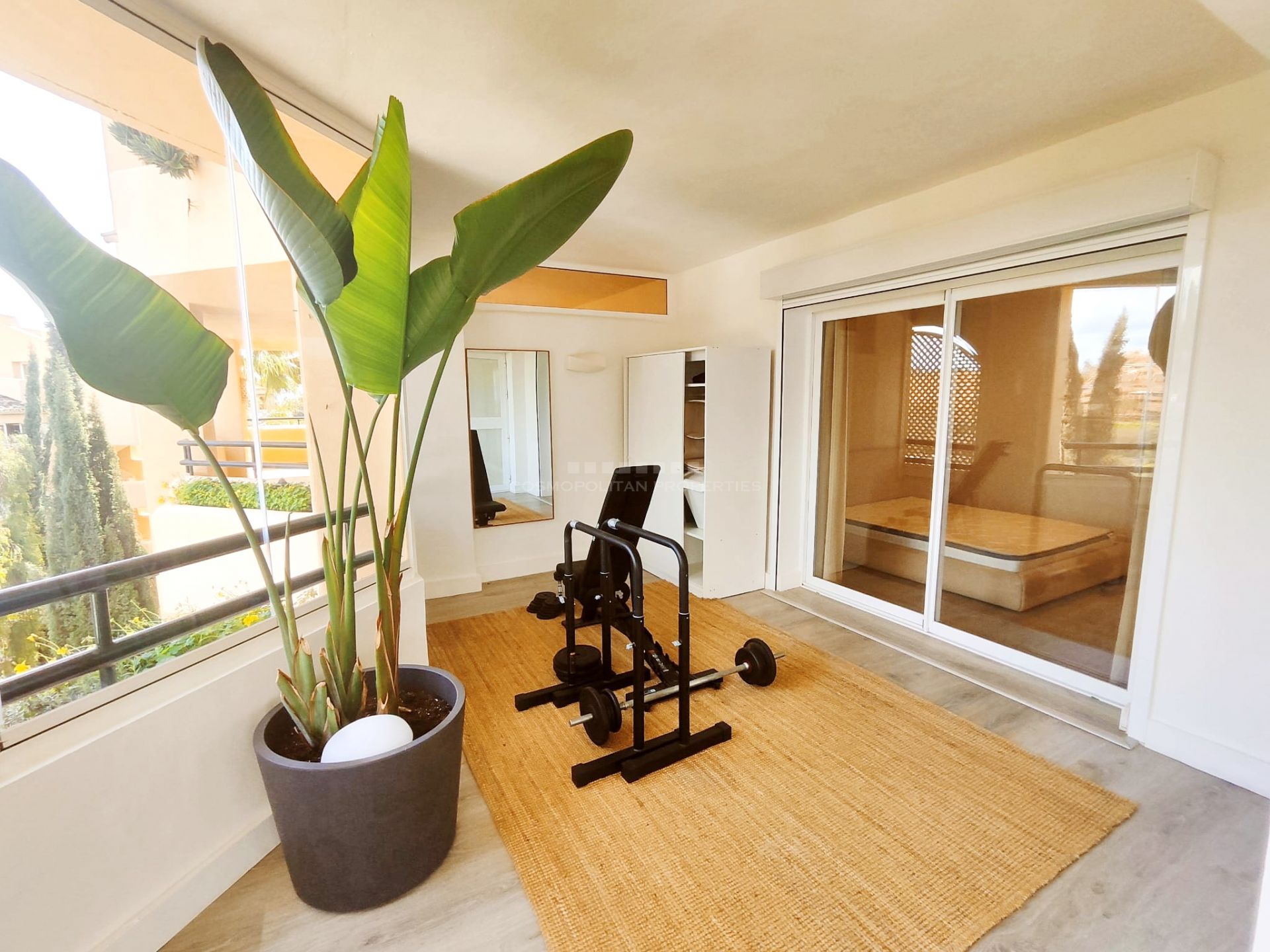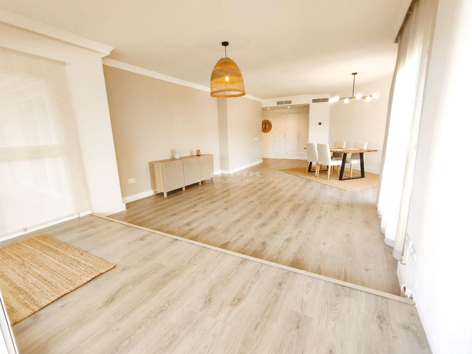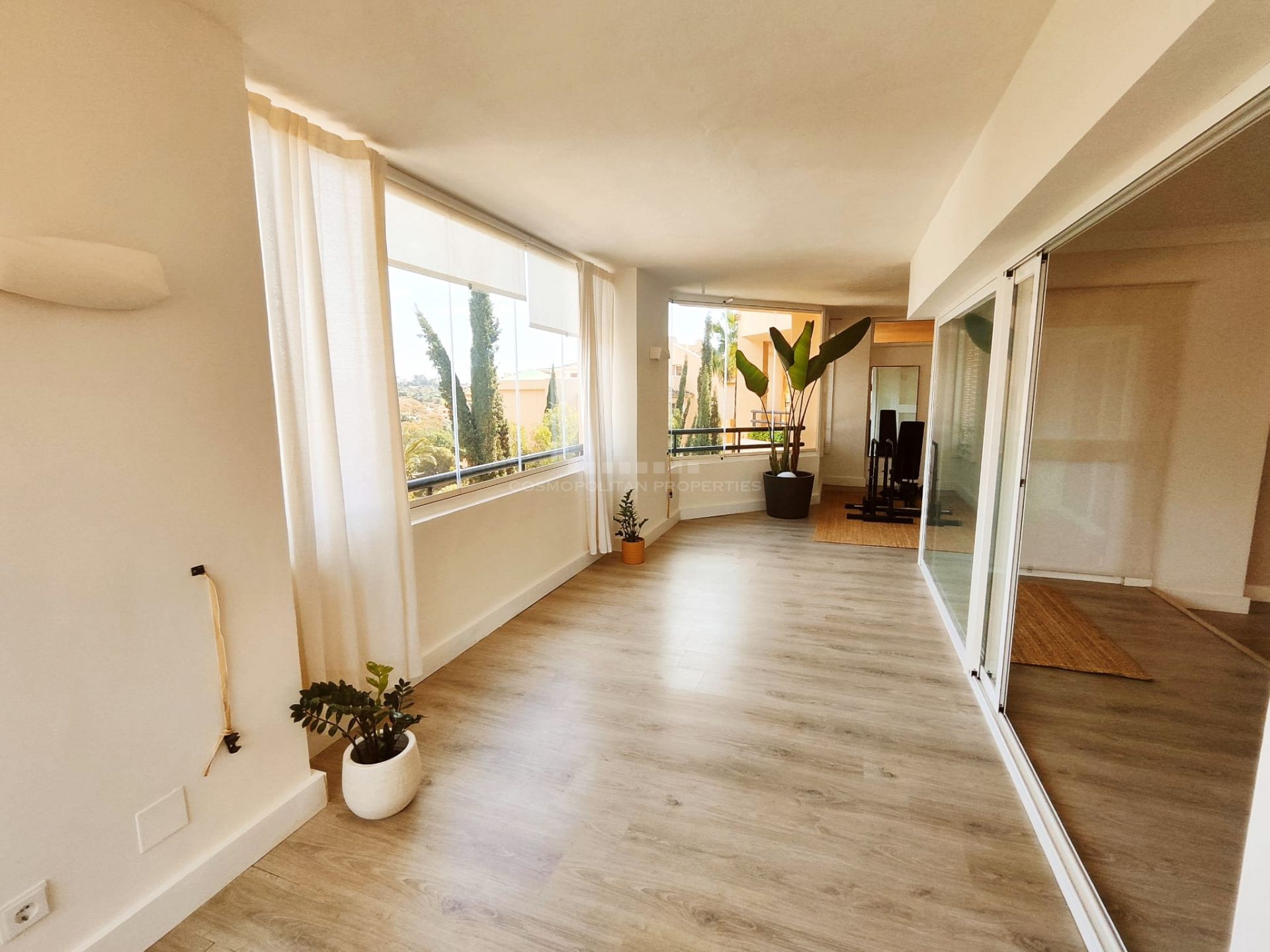 Magnífico apartamento situado en la mejor zona de Elviria a unos metros del Club Santa María Golf y a 5 minutos en coche de comercios y playas. Destaca por su amplitud - casi 190m2 construidos – y su impecable distribución que ofrece grandes espacios, Tres espléndidos dormitorios y tres baños. Al entrar, un bonito recibidor por el que se accede a un gran salón-comedor con ventanales en los dos laterales que iluminan la zona. Una terraza cubierta rodea el salón y se comunica con el dormitorio principal. El dormitorio principal tiene varios armarios empotrados, baño en-suite y acceso directo a la terraza. Los dos otros dormitorios con 2 baños en-suite se sitúan en el ala opuesta dando aún mayor privacidad. La vivienda se completa con cocina totalmente equipada. Además la propiedad tiene aire acondicionado, sistema air to air aparato nuevo de frio y calor,