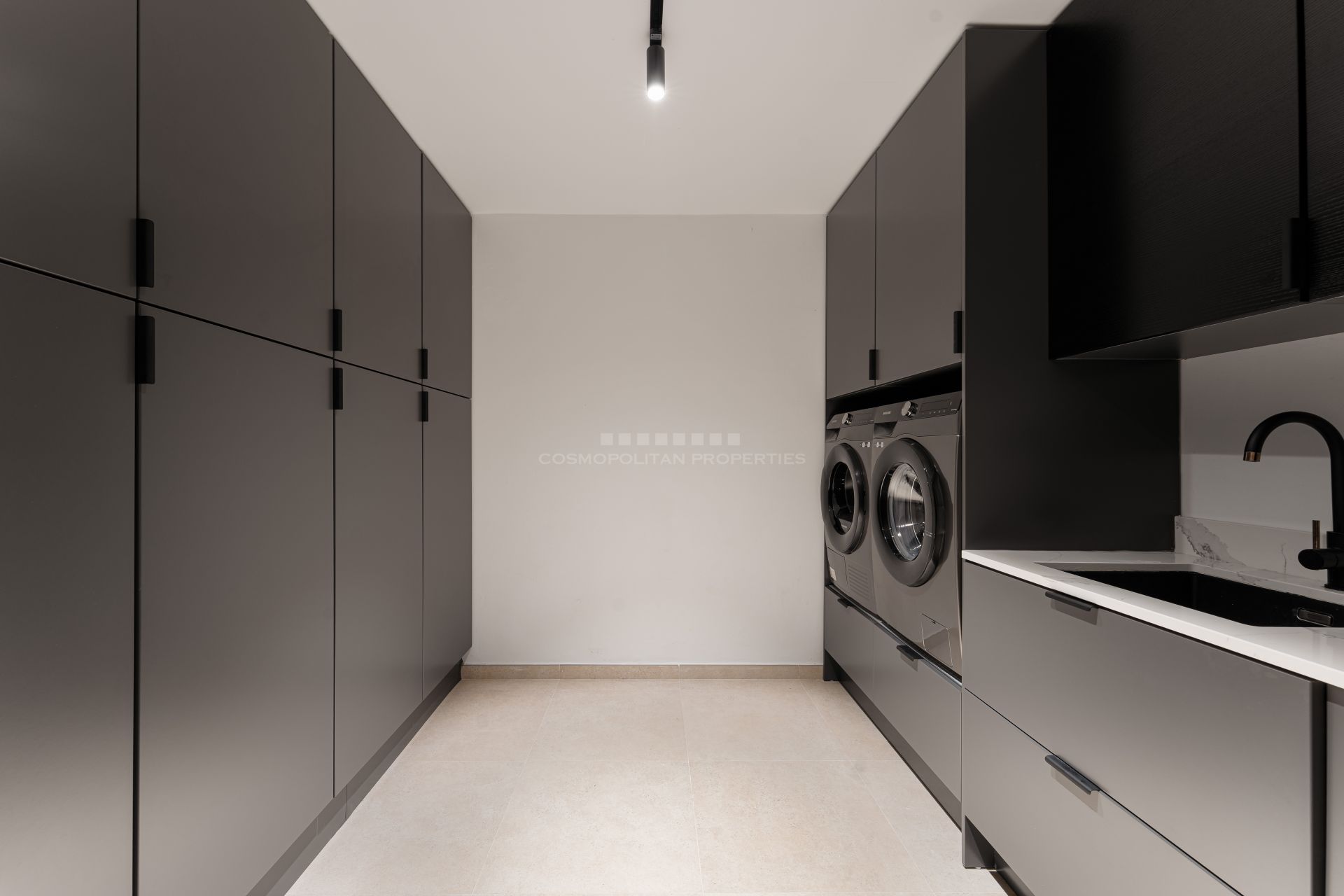 Renovated in 2024, the property retains its solid construction while integrating cutting-edge technology and sustainable features. All infrastructure systems—electrical, lighting, ventilation, and heating—have been completely replaced with energy-efficient solutions. Dual-zone central air conditioning, underfloor heating in the bathrooms, and a high-performance heating pump for the pool ensure optimal comfort throughout the year, with impressively low energy costs. Italian marble finishes, Swedish kitchen cabinetry, restaurant wine coolers and top-tier Gaggenau appliances enhance both the aesthetic and functional quality of the home.
