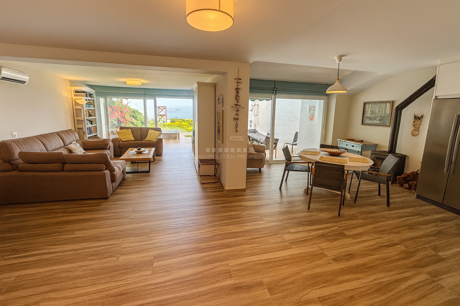 En la planta principal, encontrará un luminoso y acogedor salón-comedor de planta abierta con estufa de leña, una cocina americana totalmente equipada y un aseo de invitados. Grandes puertas correderas dan acceso directo a una amplia terraza con zona de barbacoa y un jardín privado con acceso directo a la playa.