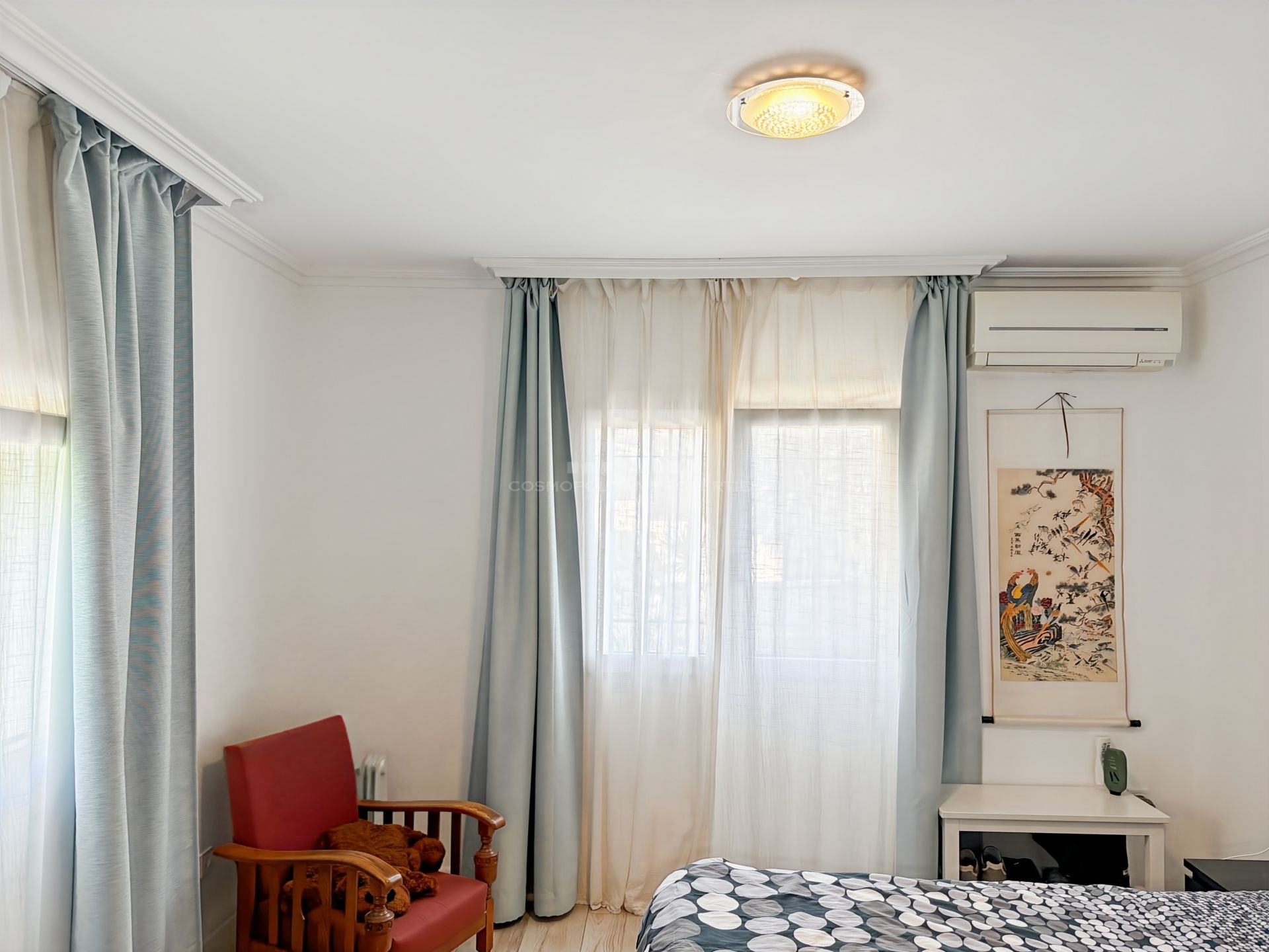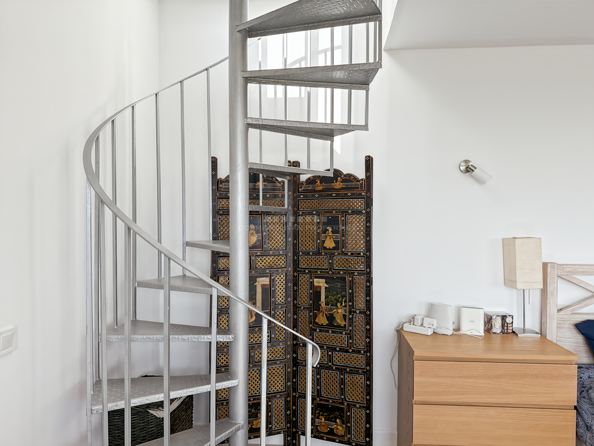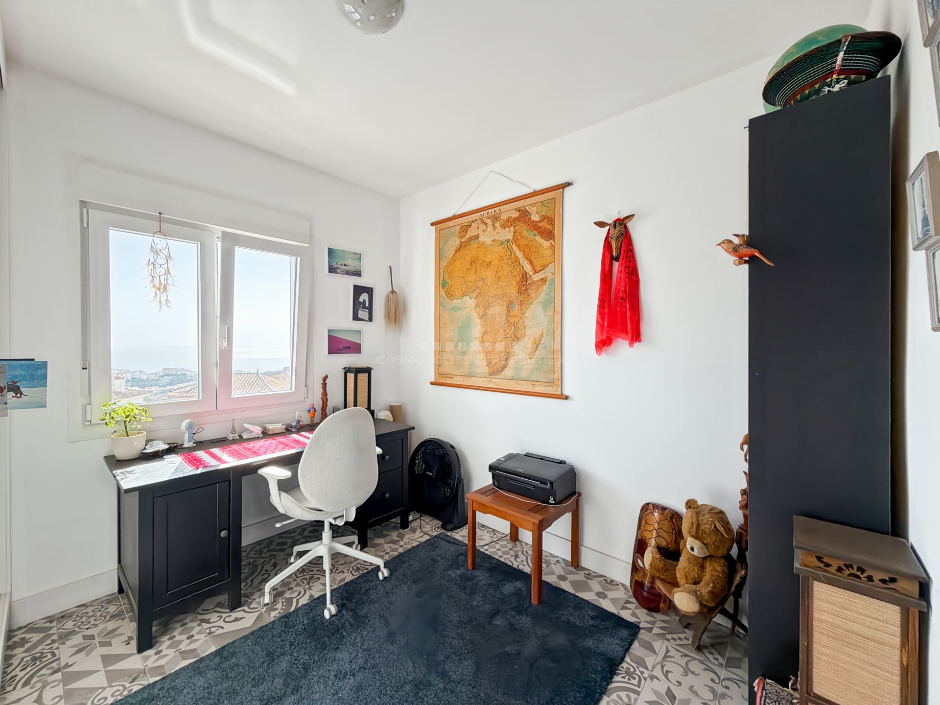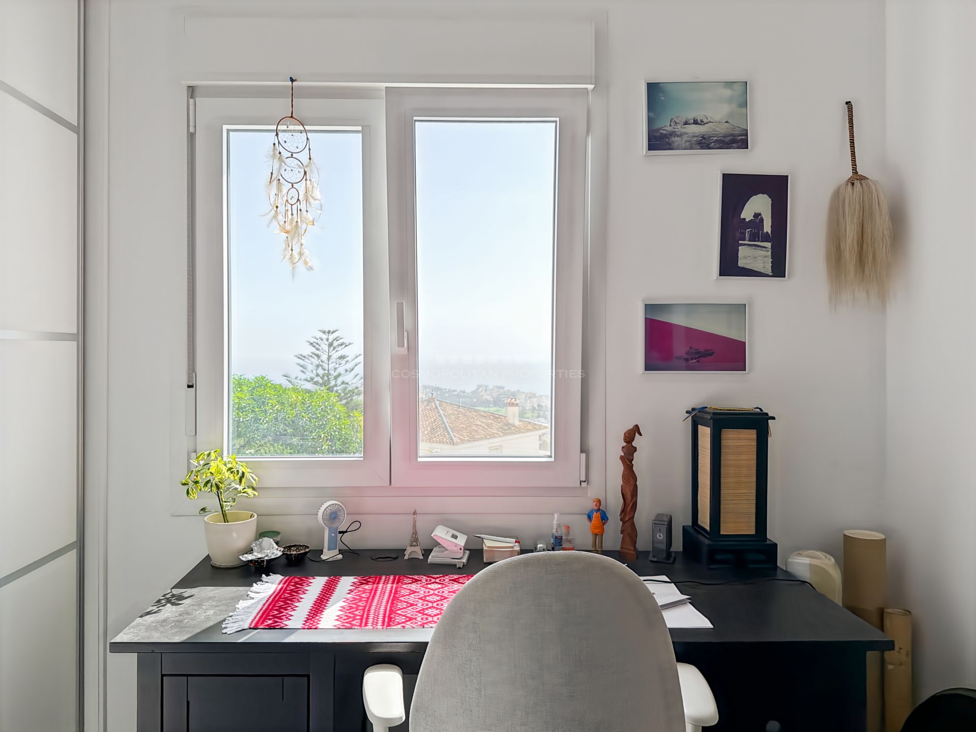 El dormitorio principal es muy espacioso y cuenta con zona de vestidor y baño en suite. Además, hay otro dormitorio actualmente utilizado como despacho, un segundo baño completo, y un tercer dormitorio de gran tamaño con escalera que conduce a una azotea privada, ideal para tomar el sol o disfrutar de las vistas.