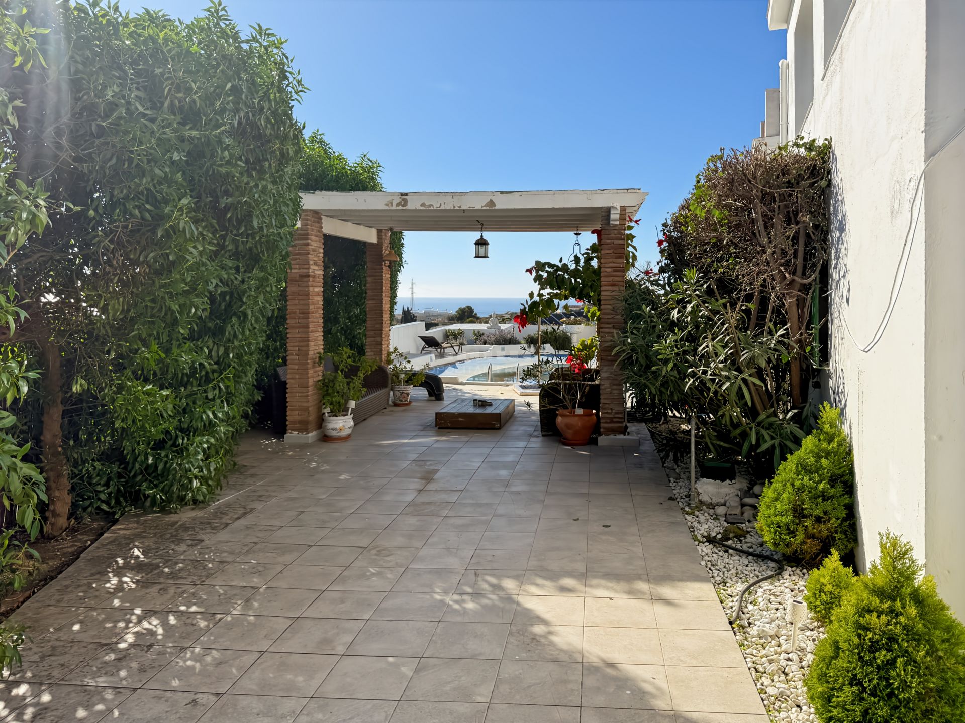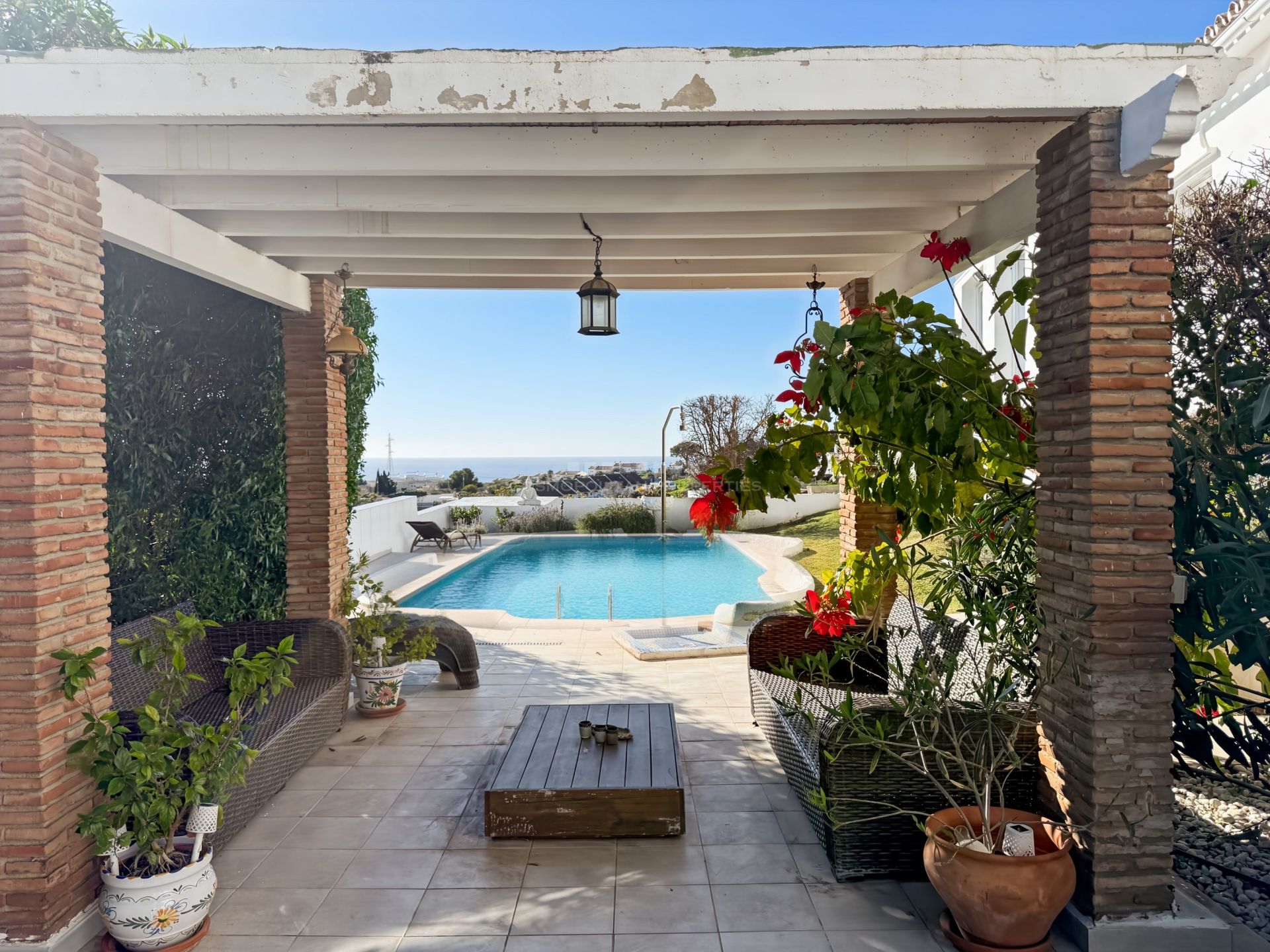 En el exterior, la villa ofrece un jardín privado muy bien cuidado con plantas tropicales, una piscina privada zon vistas al mar y zona de descanzo y baño exterior con ducha, así como un garaje con capacidad para varios vehículos.