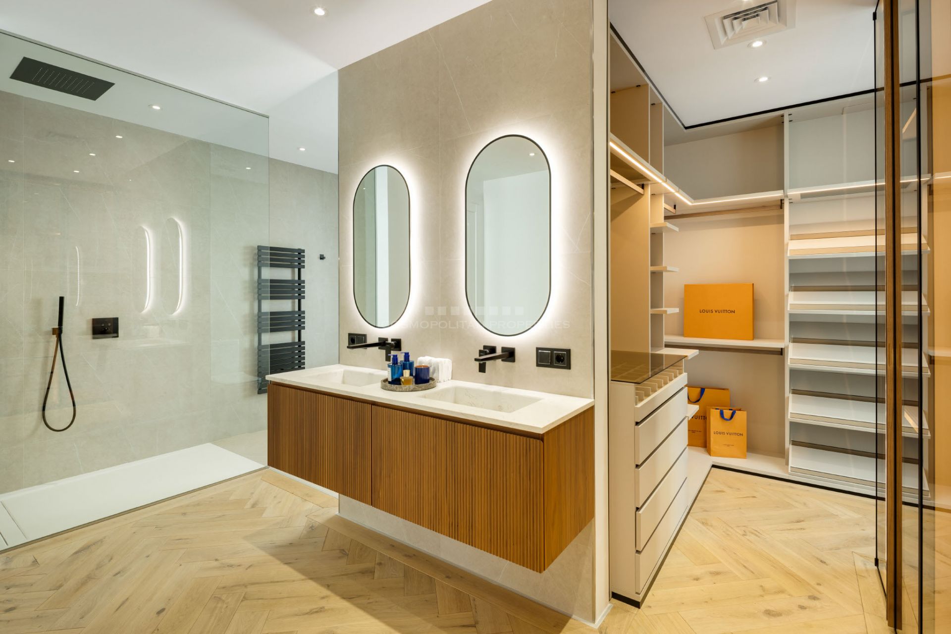 La suite principal destaca por su diseño como un refugio privado, con un vestidor a medida y un lujoso baño con acabados de porcelana Villeroy & Bosch, grifería Hansgrohe, bañera exenta y una amplia ducha a ras de suelo. Todos los dormitorios adicionales mantienen el mismo nivel de artesanía, incorporando armarios Uecko y acabados con detalles de gran belleza.