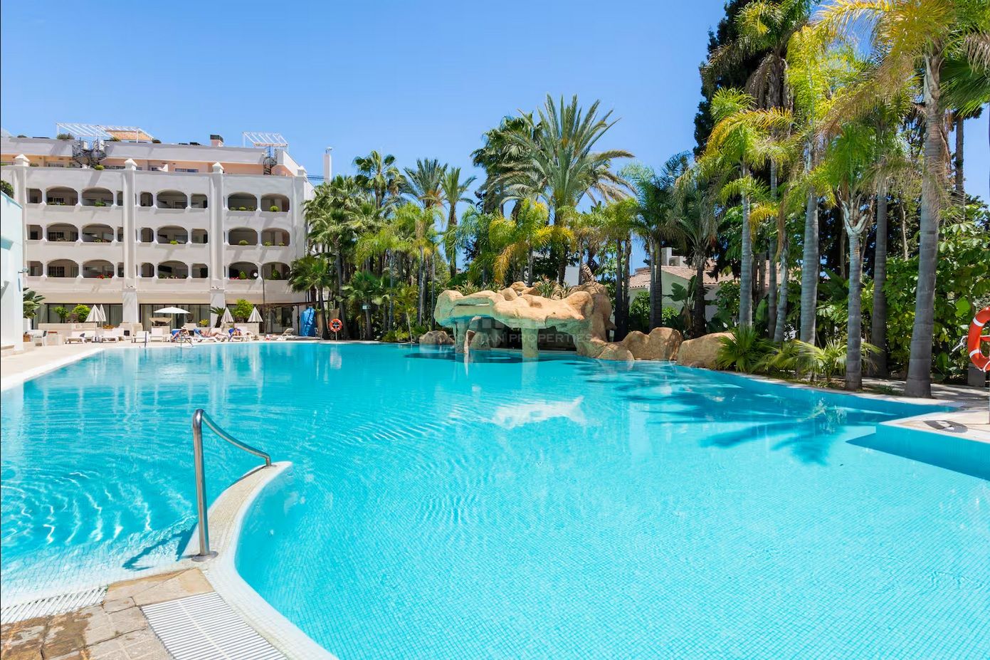 Fantástico apartamento totalmente reformado de dos dormitorios y dos baños situado en una primera planta, en el Hotel Guadalpín, Marbella, edificio emblemático en la Milla de Oro, a unos pasos de la playa y a poca distancia de todos los comercios y servicios necesarios.