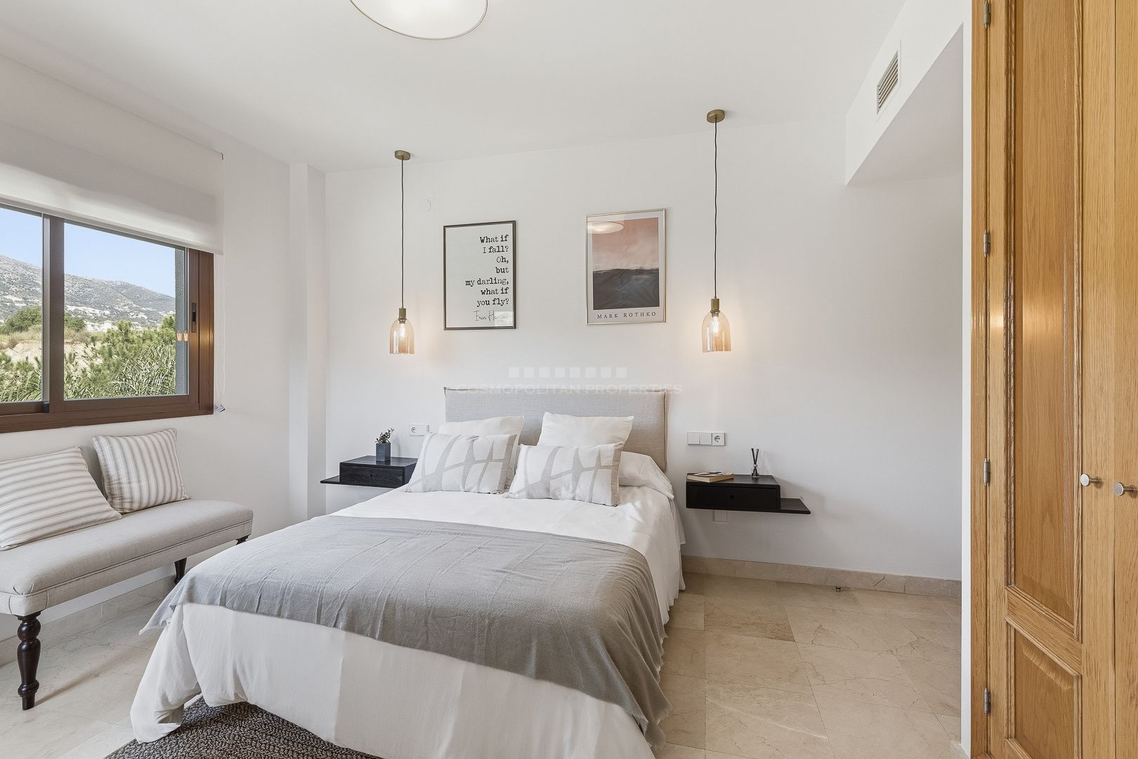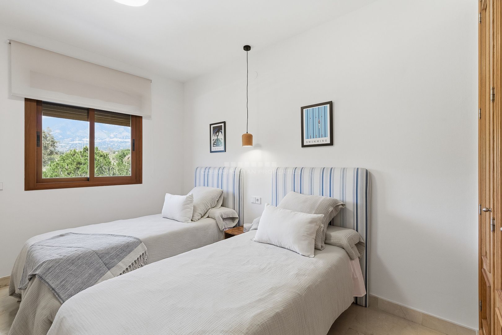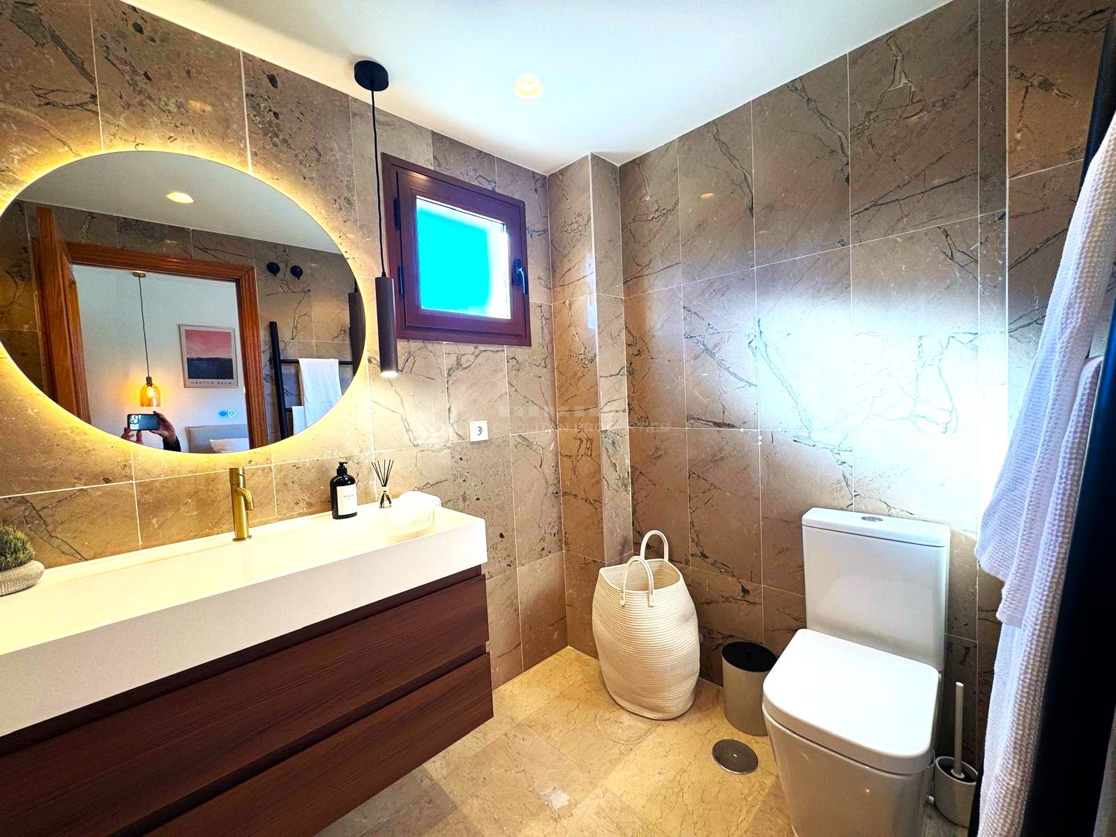 La propiedad cuenta con tres dormitorios. Dos de ellos son dobles y están completamente amueblados. El dormitorio principal dispone de balcón privado, bonitas vistas a la montaña y un baño en suite totalmente reformado. Los otros dos dormitorios comparten un segundo baño con ducha, también renovado con materiales de calidad.
