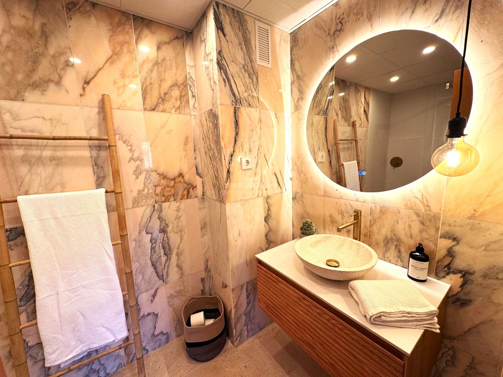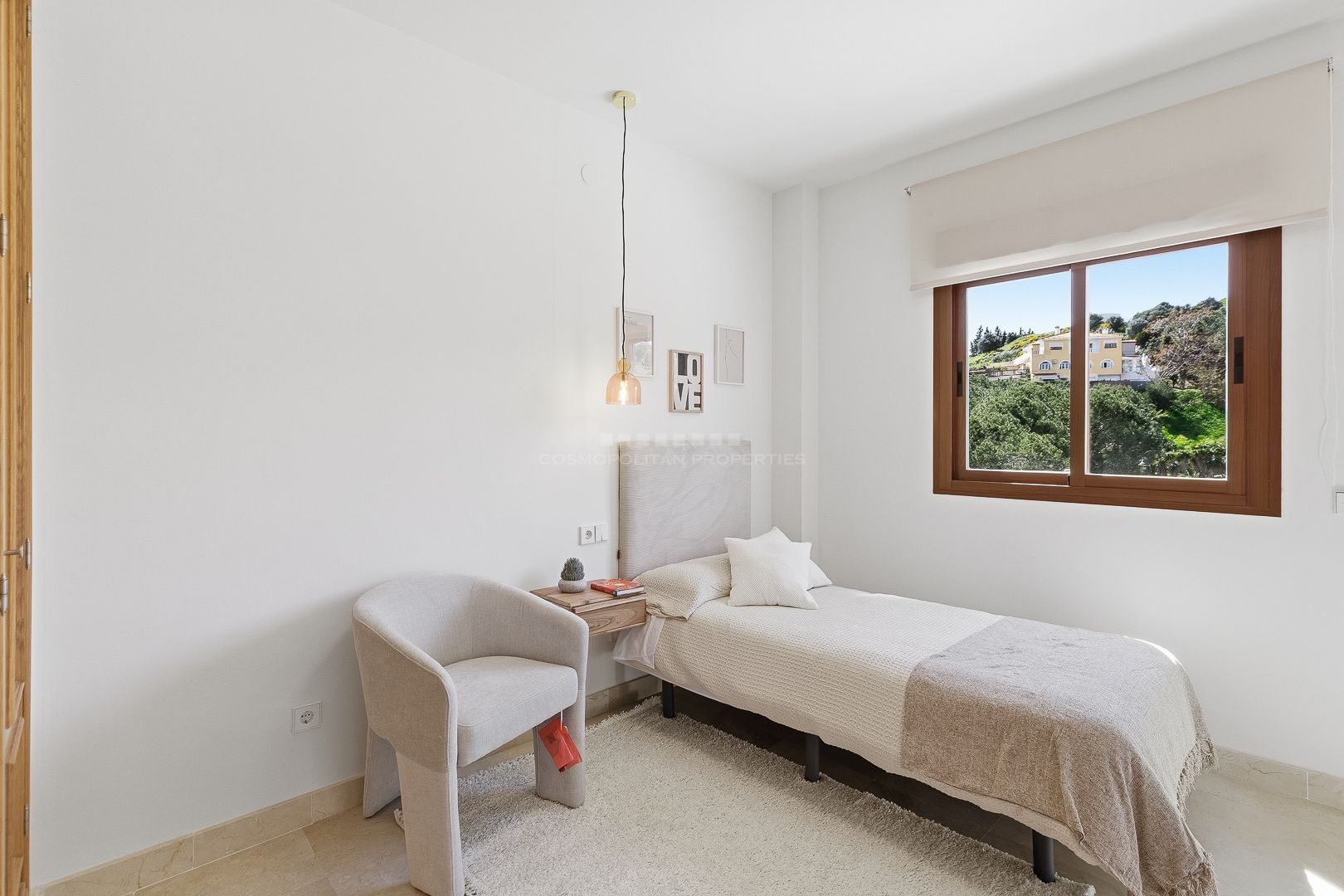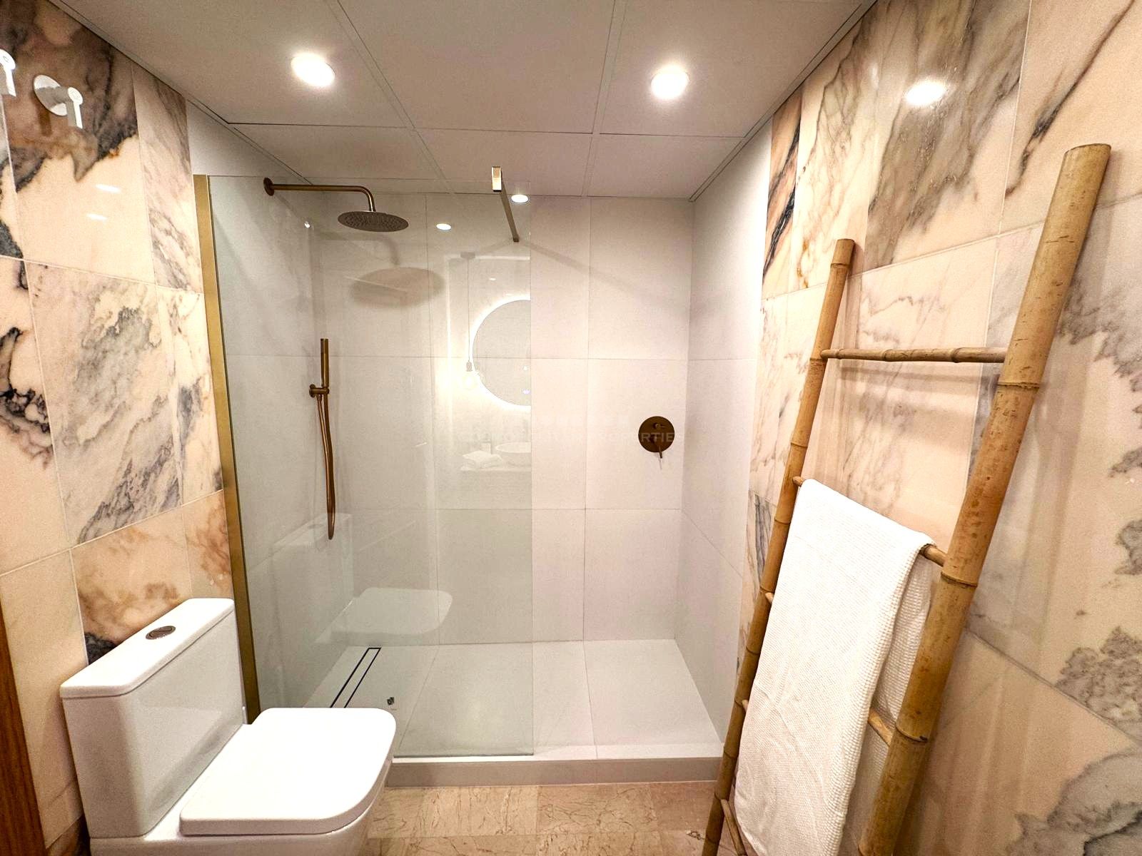 La propiedad cuenta con tres dormitorios. Dos de ellos son dobles y están completamente amueblados. El dormitorio principal dispone de balcón privado, bonitas vistas a la montaña y un baño en suite totalmente reformado. Los otros dos dormitorios comparten un segundo baño con ducha, también renovado con materiales de calidad.