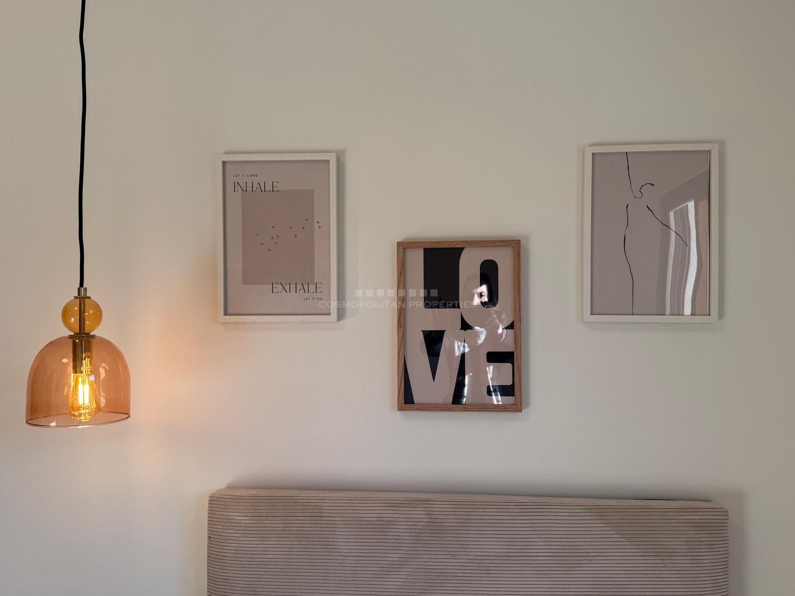 El interior ha sido cuidadosamente diseñado para crear espacios modernos, frescos y armoniosos, donde la amplitud y la luz natural son protagonistas. Dispone de una elegante zona de comedor con capacidad para seis comensales y un acogedor salón con área de TV, desde el cual se accede a una fantástica terraza orientada al suroeste, ideal para disfrutar de espectaculares puestas de sol.