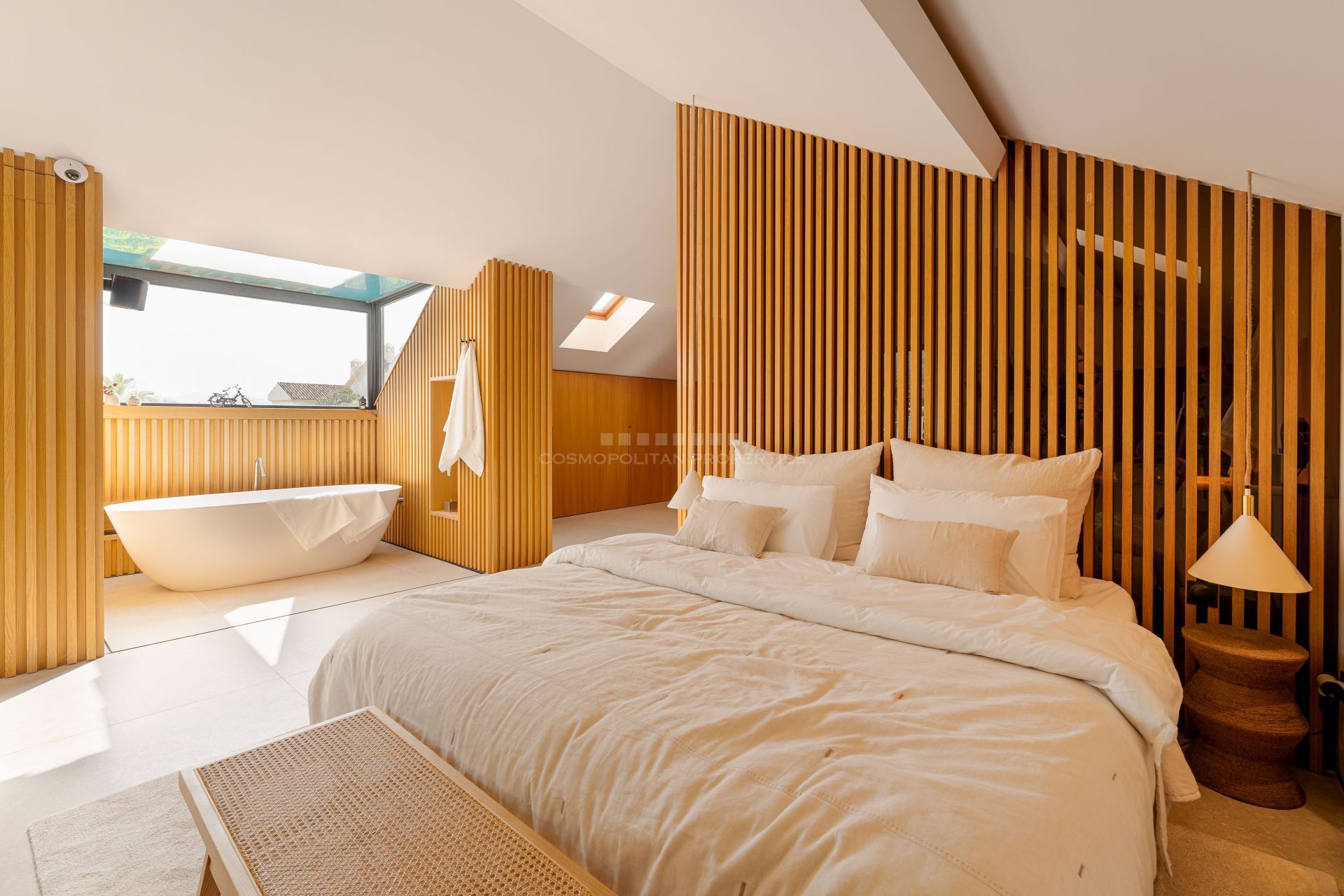 Este dúplex ha sido completamente renovado con los más altos estándares de calidad y equipado con comodidades de última generación, como aire acondicionado con sistema Air Zone, calefacción por suelo radiante, iluminación LED, sistema de música integrado y cortinas automáticas, todo ello fácilmente controlable mediante un sistema domótico inteligente. Los elementos de madera natural complementan las líneas limpias, y la tecnología integrada, como persianas eléctricas y un sistema de seguridad inteligente con doble acristalamiento y persianas de seguridad, garantiza un equilibrio perfecto entre comodidad y seguridad. El ático se distribuye en dos plantas, cuidadosamente diseñadas para optimizar la fluidez del espacio y la integración entre el interior y el exterior. La planta baja consta de la sala de estar principal, dos dormitorios (uno de ellos actualmente utilizado como despacho), dos baños en suite y un comedor con acceso directo a una amplia terraza orientada al sur, ideal para recibir invitados o disfrutar de una relajada cena al aire libre. La cocina está totalmente equipada con electrodomésticos Simens de alta gama y cuenta con gabinetes y encimeras de primera calidad que se adaptan a la estética moderna.