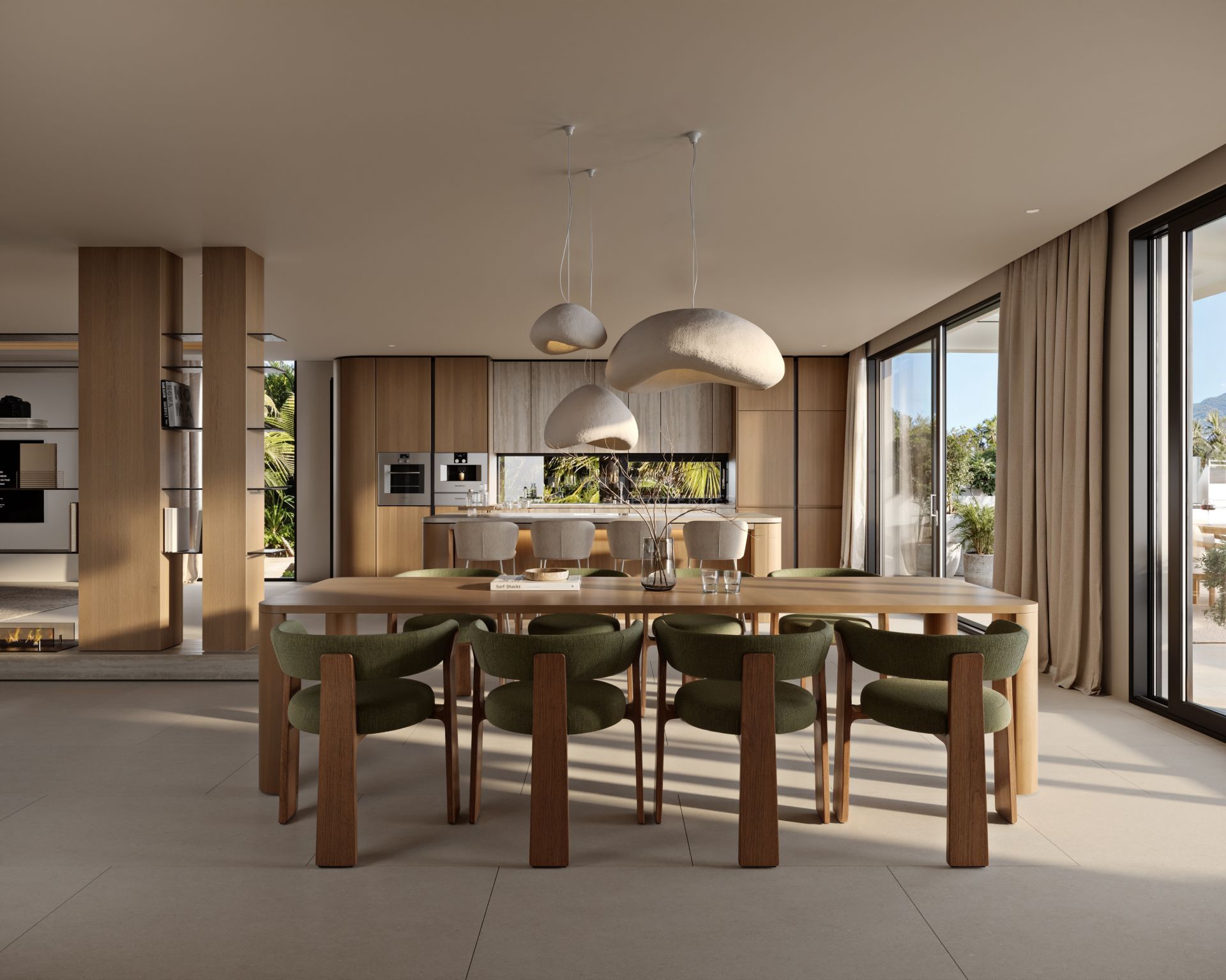 En el interior, Villa Tulua cuenta con cinco dormitorios bien proporcionados y cuatro elegantes baños, ofreciendo flexibilidad tanto para familias como para invitados. La distribución promueve una vida fluida con una amplia cocina, salón y comedor de planta abierta que se integra a la perfección con la terraza principal. Esta terraza es ideal para recibir invitados, con una cocina al aire libre y una gran piscina privada con sistema de chorros. Desde aquí, podrá relajarse o recibir invitados con vistas que se extienden por todo el valle del golf y la costa.