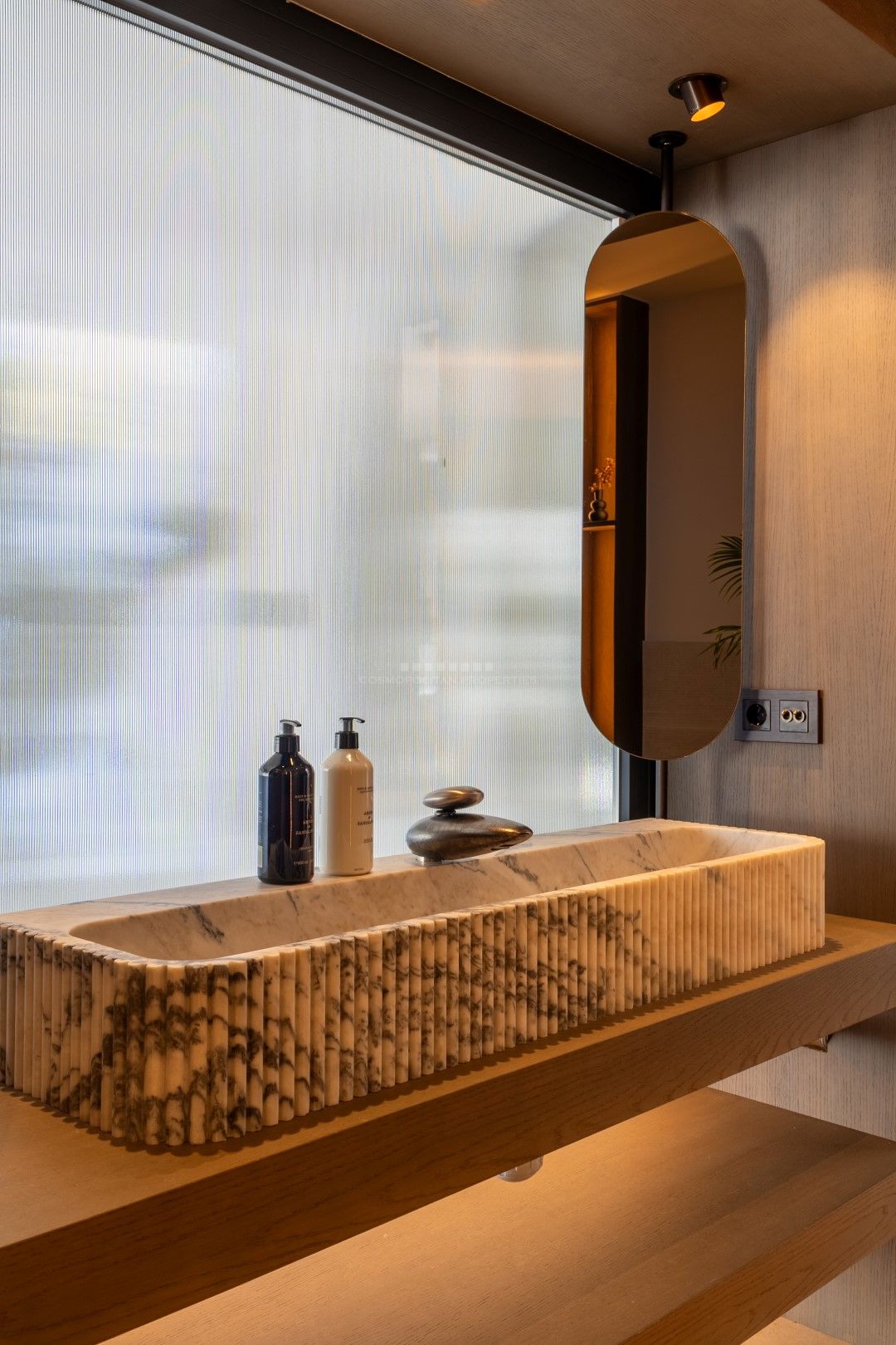 En su interior, encontrará un uso armonioso de materiales naturales y colores relajantes, creando un ambiente acogedor que invita a la relajación. Su espaciosa distribución cuenta con cinco dormitorios de hermoso diseño y seis baños modernos, lo que la convierte en un espacio ideal para familias y quienes disfrutan del entretenimiento.