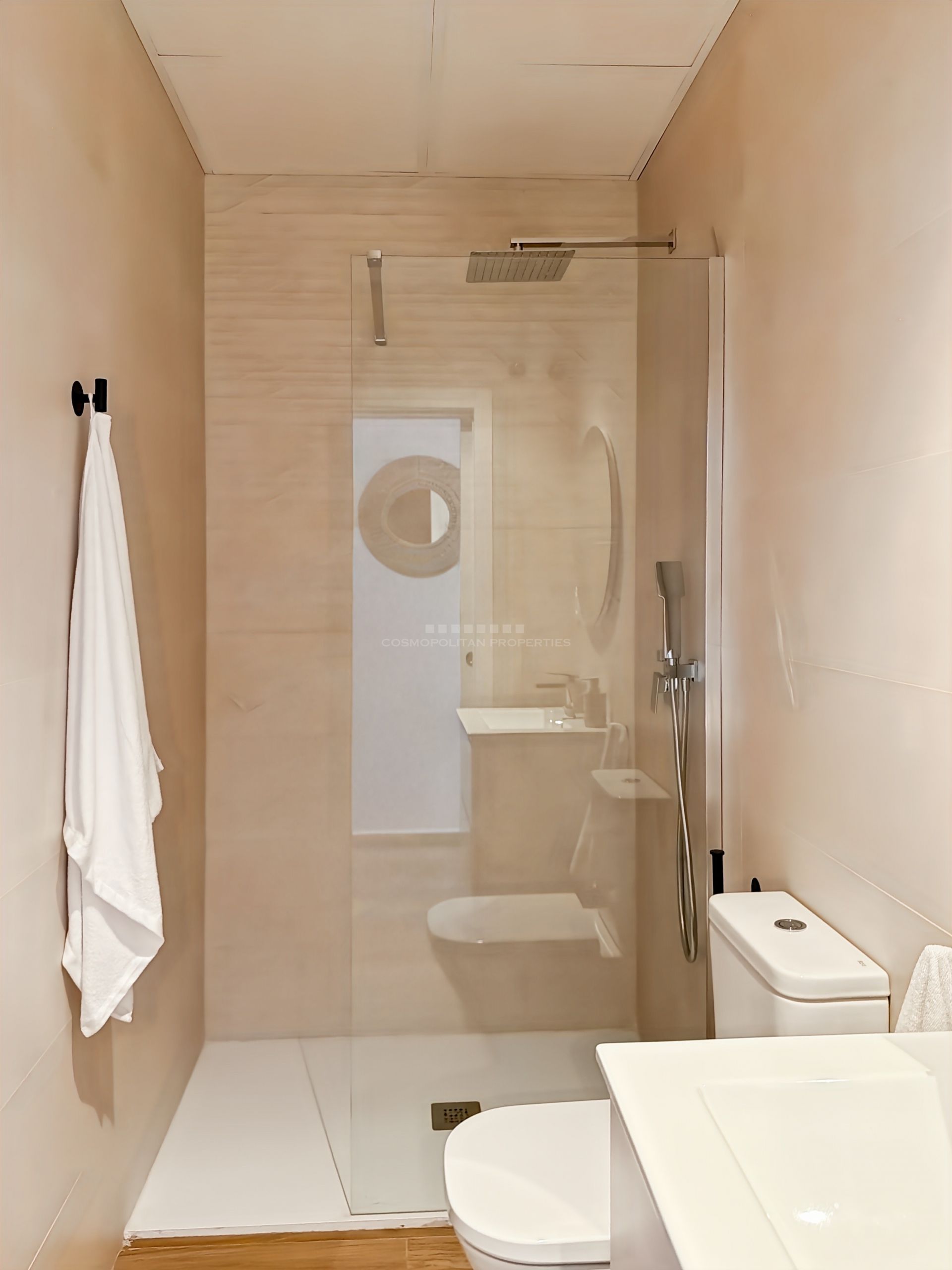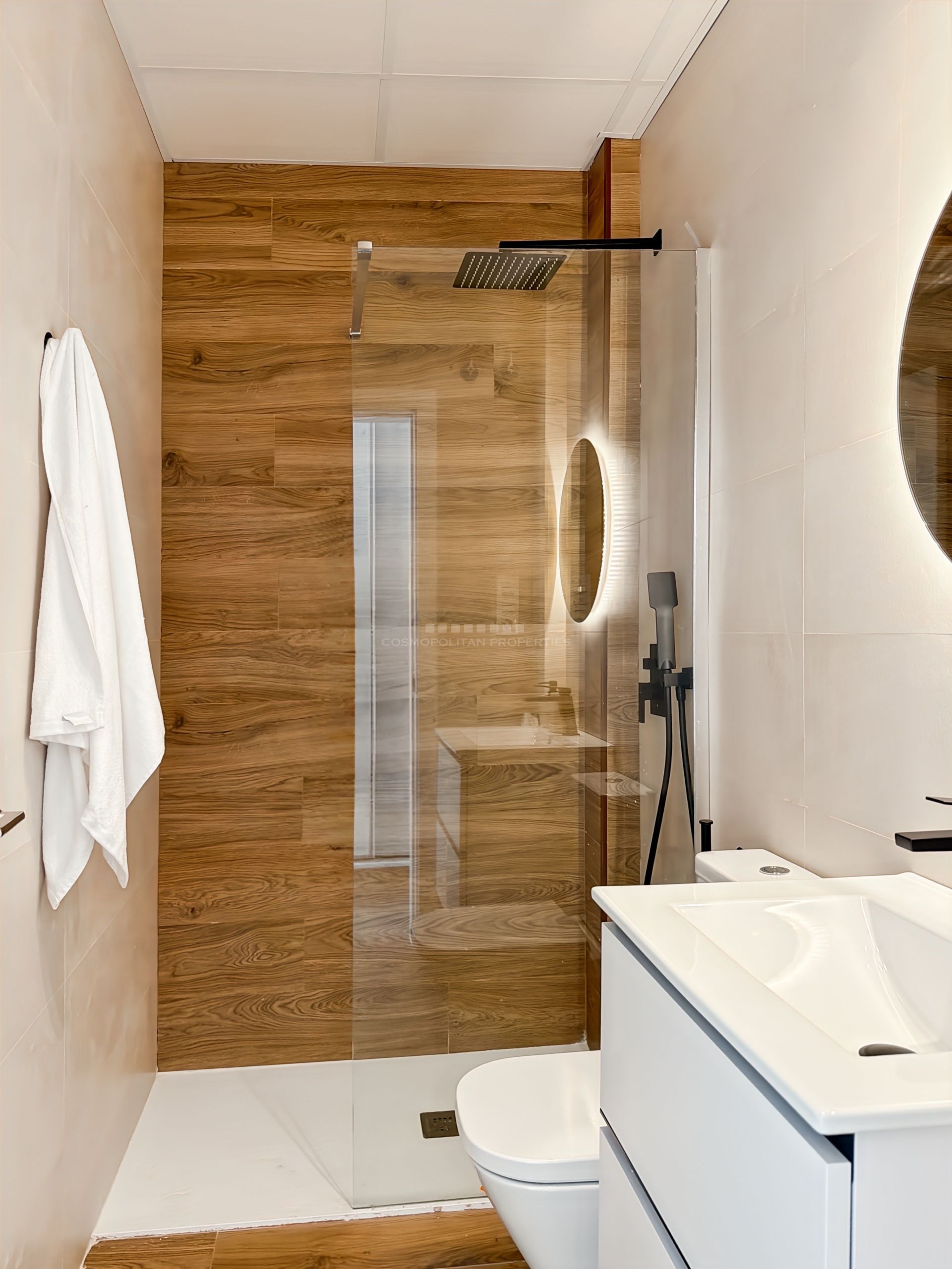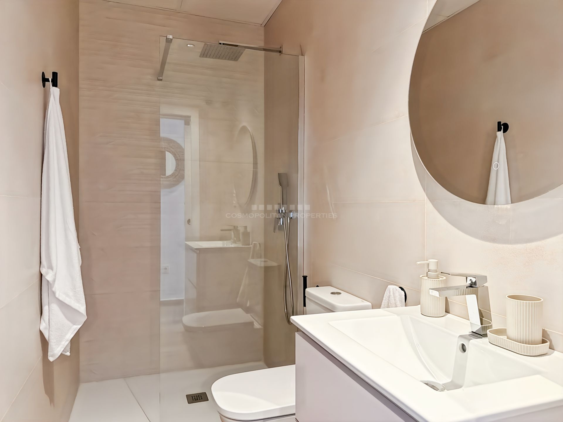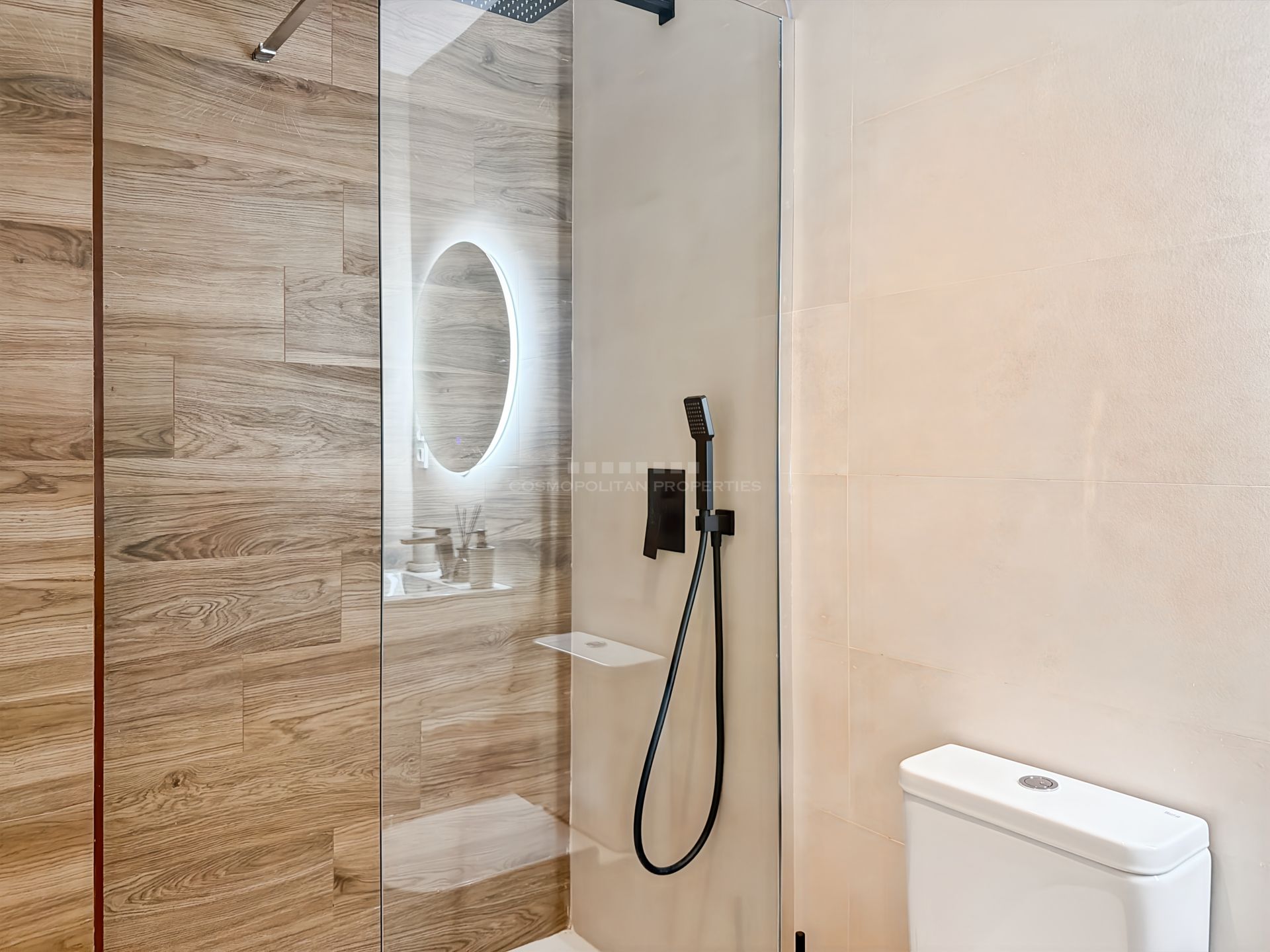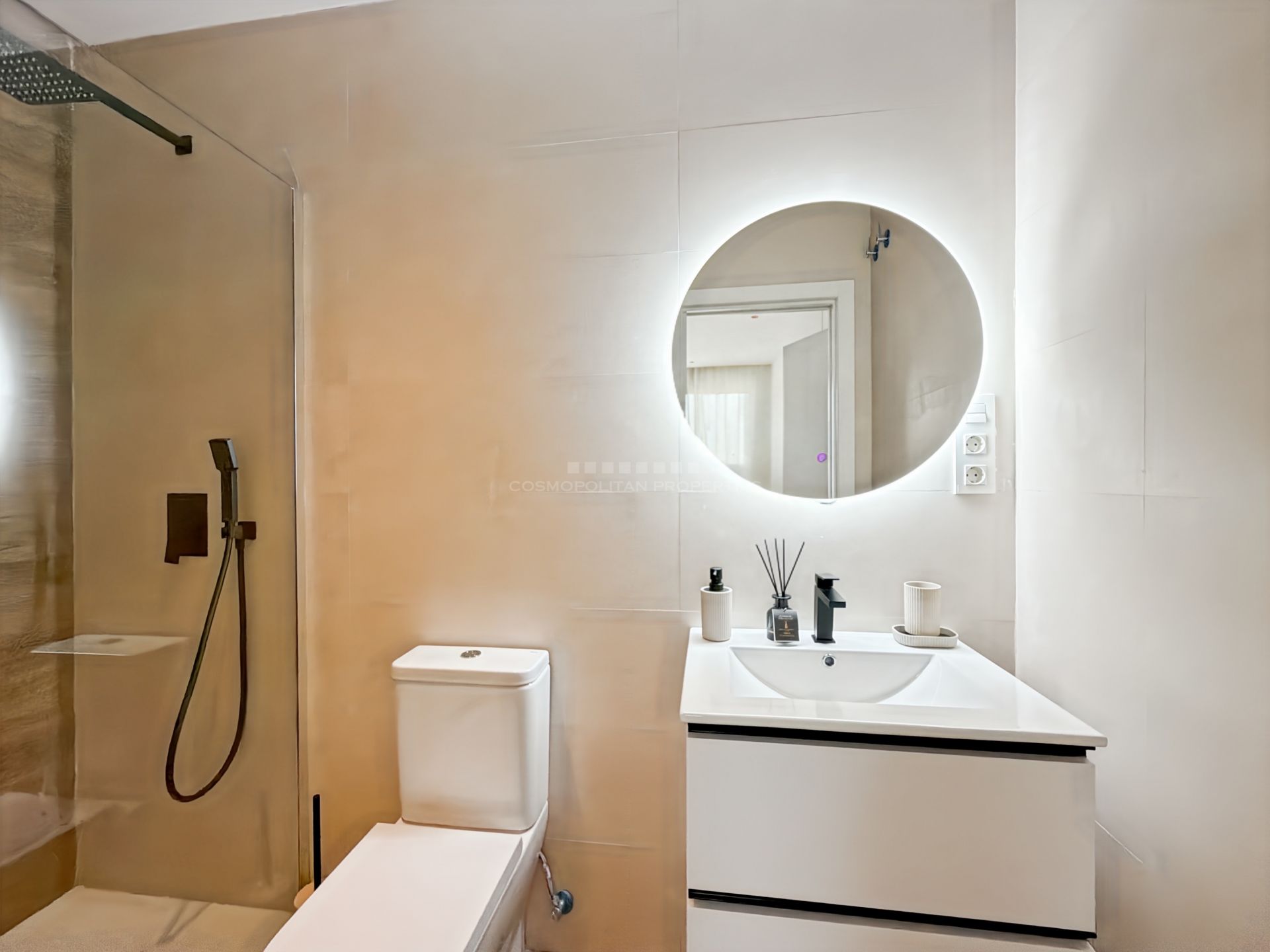 El baño en suite del dormitorio principal sorprende con su estilo contemporáneo: paredes en tonos beige suaves, espejo retroiluminado, mueble suspendido y una ducha tipo lluvia con grifería en negro mate que aporta carácter y modernidad. El segundo baño mantiene la misma línea de diseño y confort.