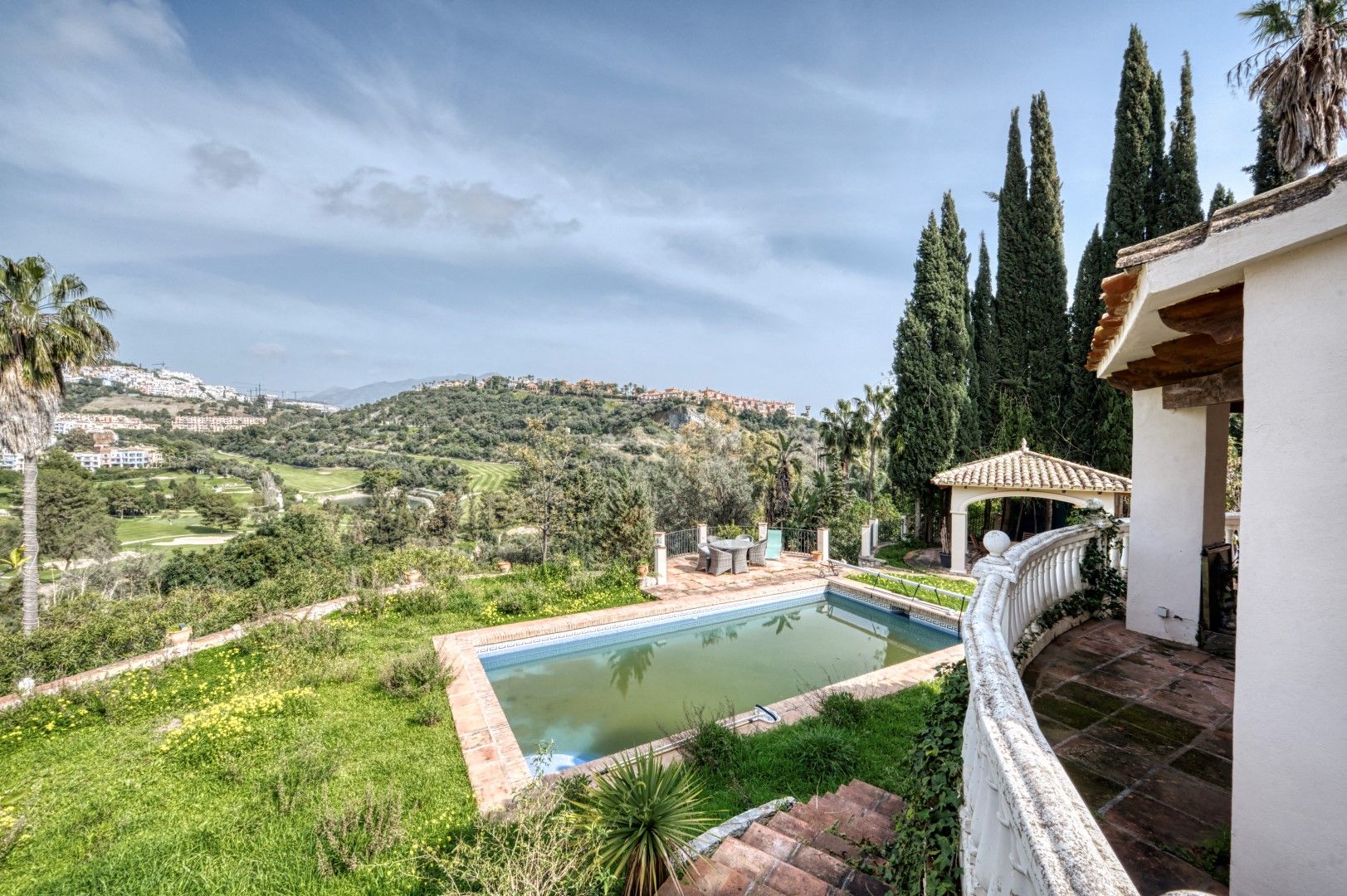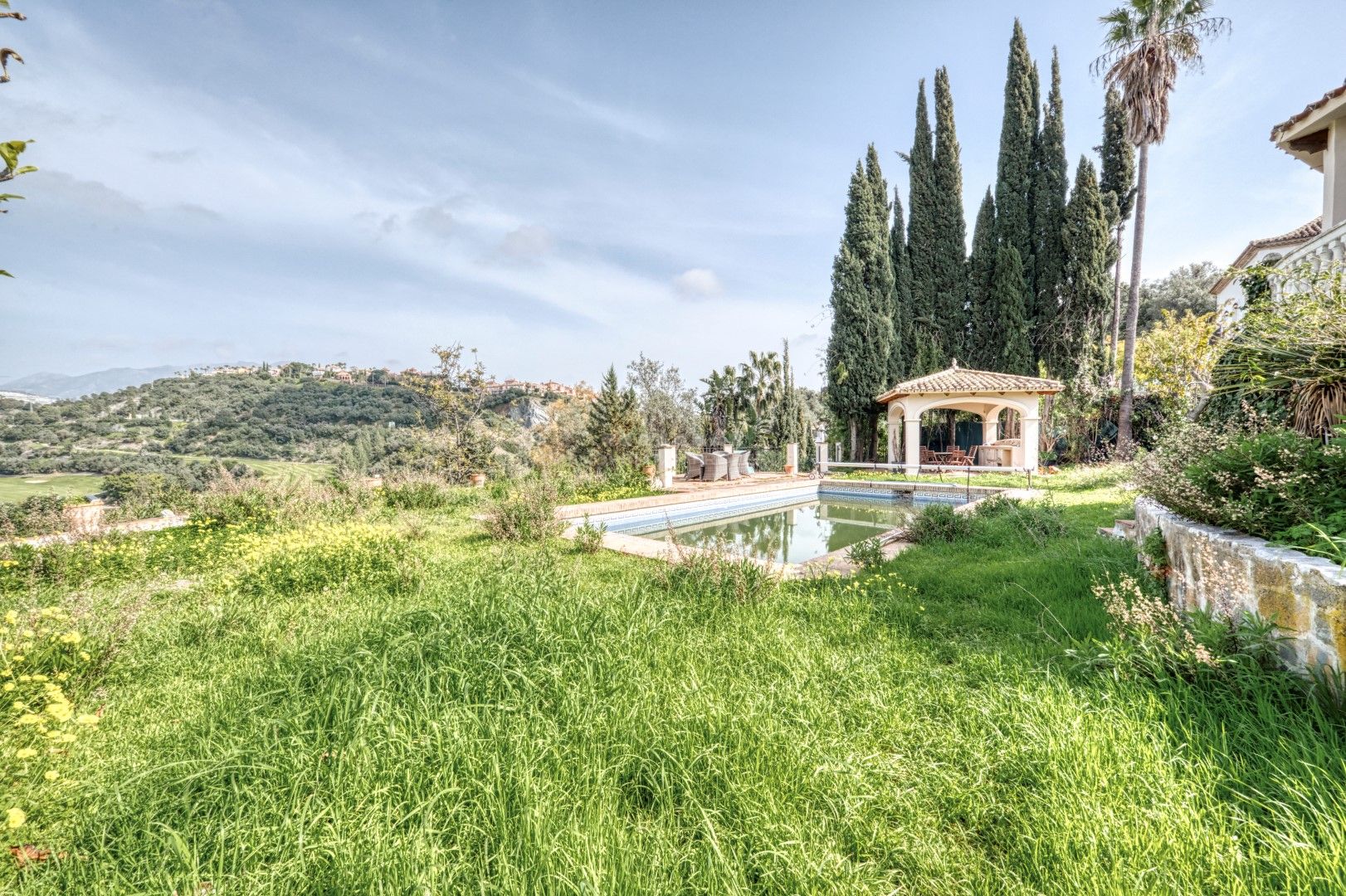 Elegante y espaciosa villa con gran potencial de reforma, situada en una exclusiva urbanización privada de Benahavís, en la codiciada zona de Puerto del Almendro. Gracias a su orientación este, la propiedad disfruta de abundante luz natural durante toda la mañana, así como de impresionantes vistas panorámicas al campo de golf.