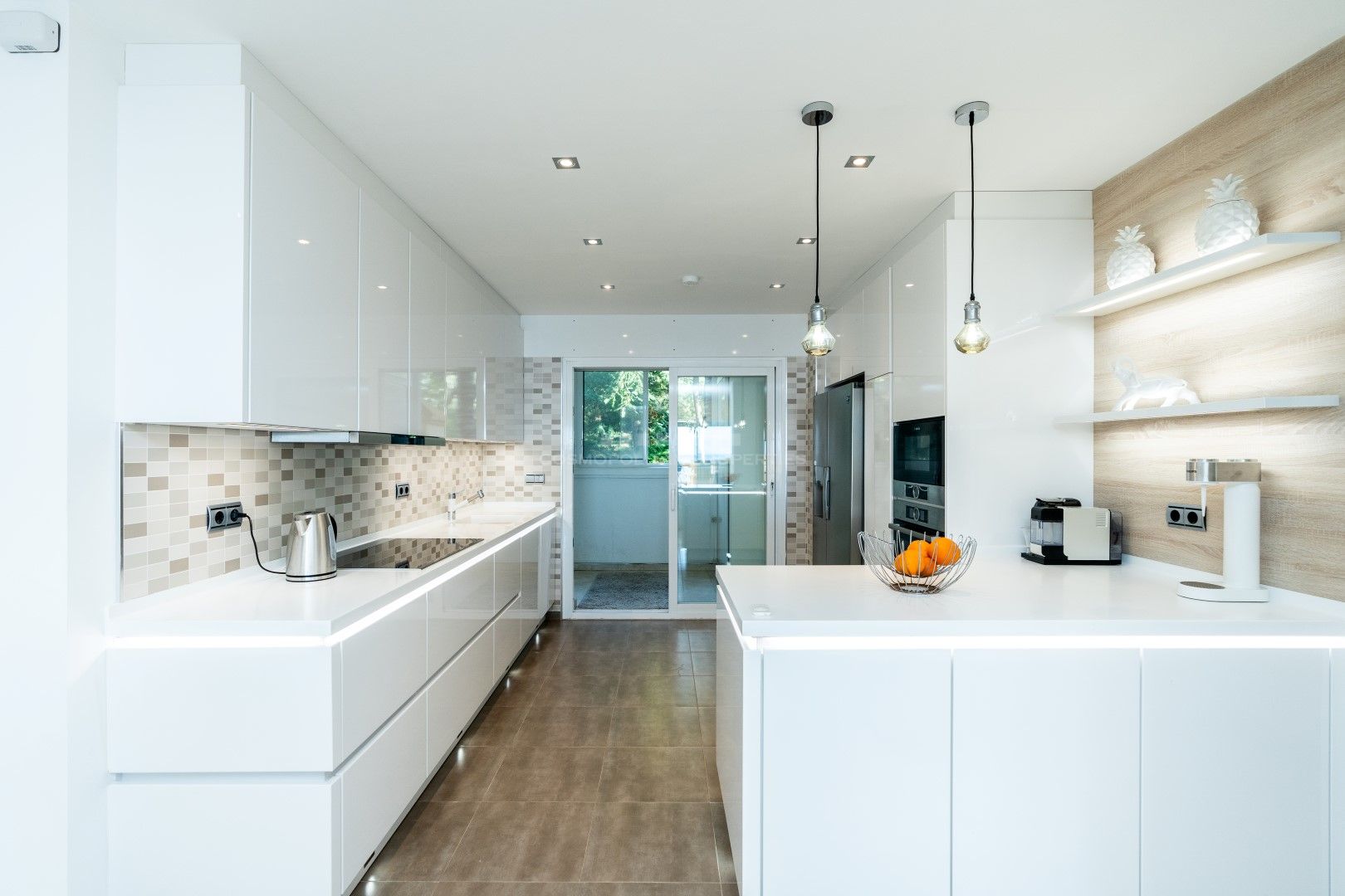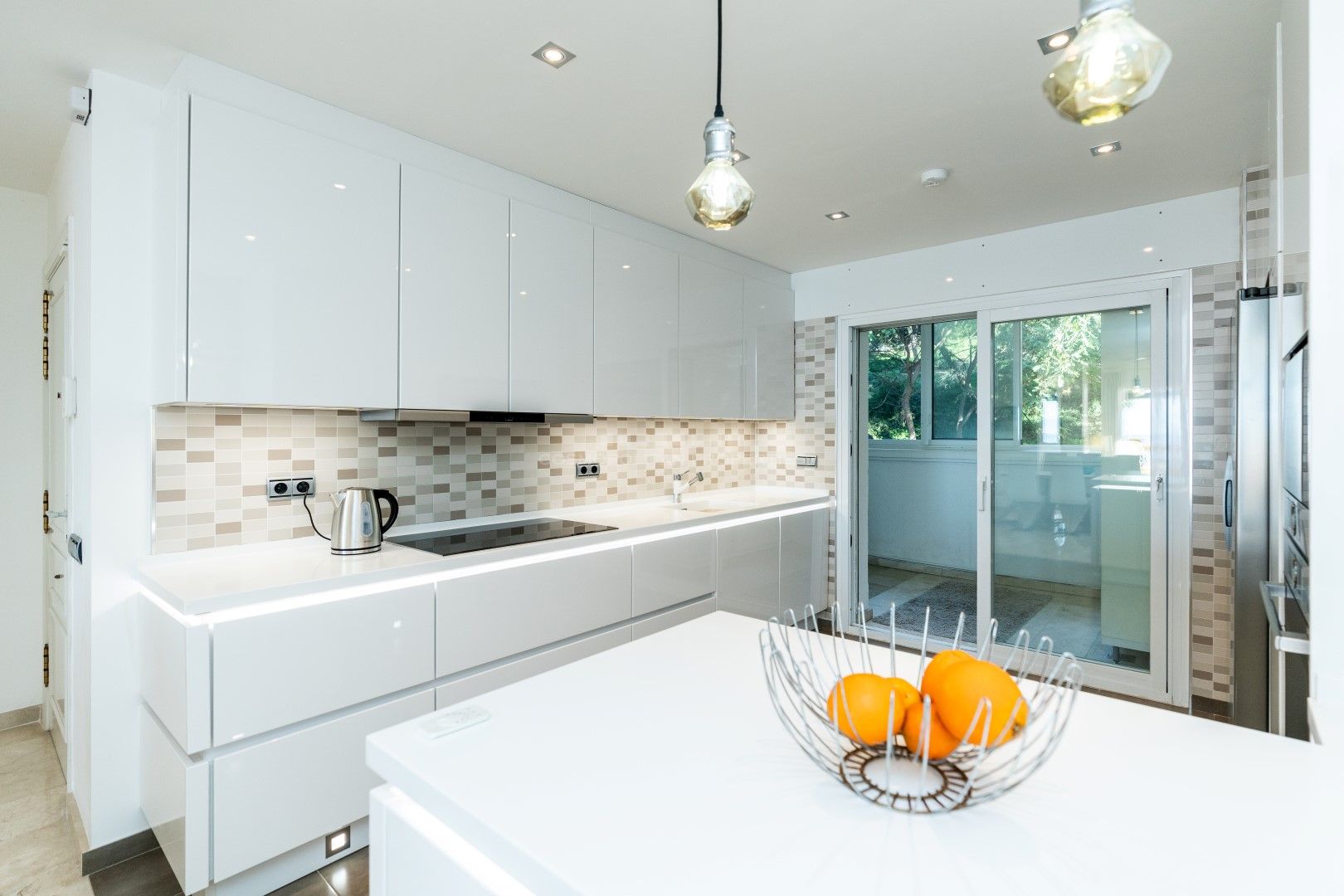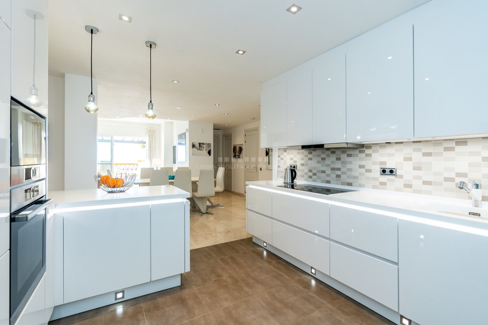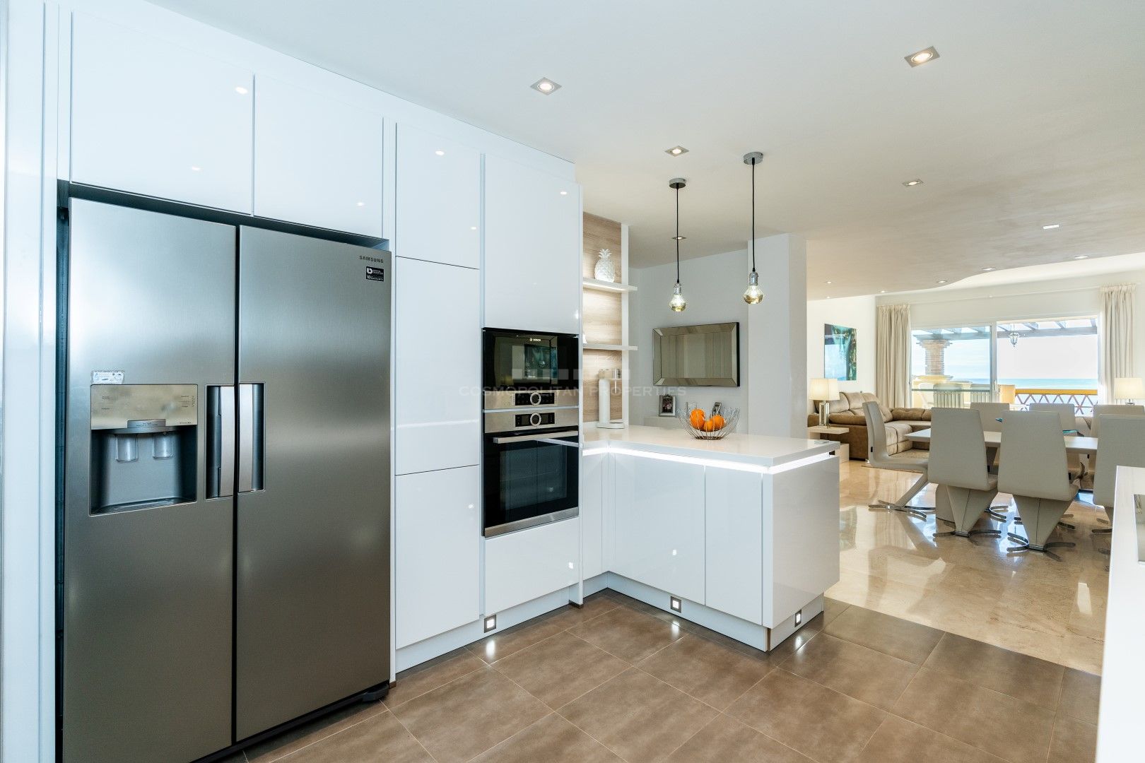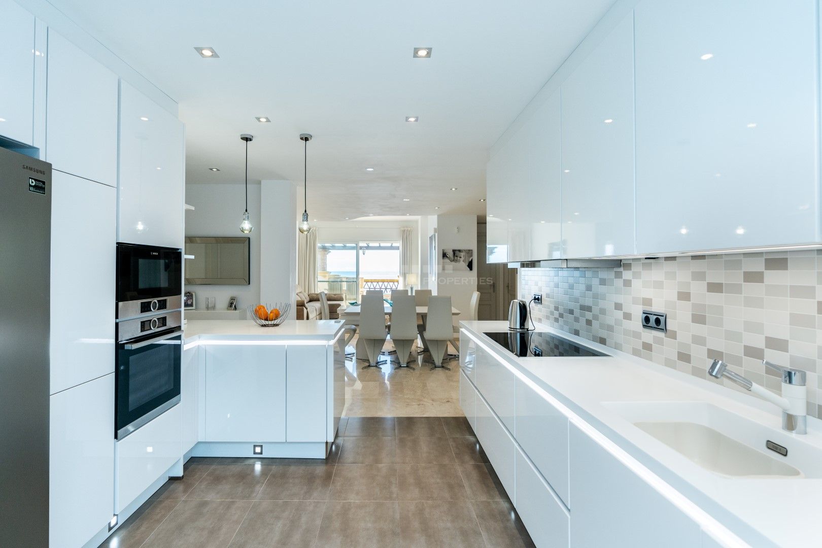 El apartamento cuenta con una cocina de diseño abierta equipada con electrodomésticos de alta gama, armarios empotrados y muchos otros detalles de lujo. Con abundante luz natural, tanto el amplio salón como el dormitorio principal tienen acceso directo a una impresionante terraza, un lugar ideal para relajarse y disfrutar de la brisa marina con vistas espectaculares.