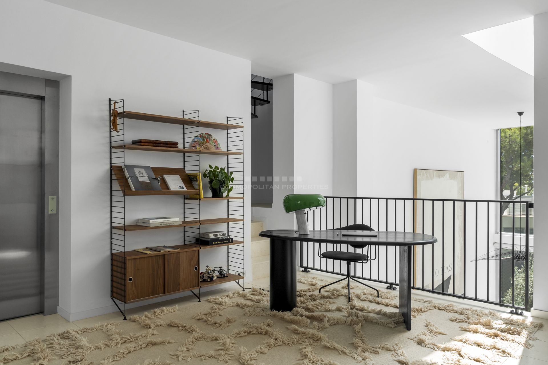 Distribuida en cuatro niveles, todas las plantas están conectadas por un ascensor privado que permite un acceso cómodo desde la planta baja hasta la azotea. Esta casa adosada combina a la perfección el diseño moderno y los detalles arquitectónicos, creando un estilo de vida de confort, privacidad y sofisticación.